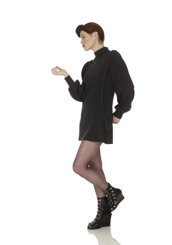 The Contour Jersey Dress is made from fully traceable Merino Wool Jersey from New Zealand. In contemporary charcoal grey marl with violet piping - this is a figure hugging and short dress style.