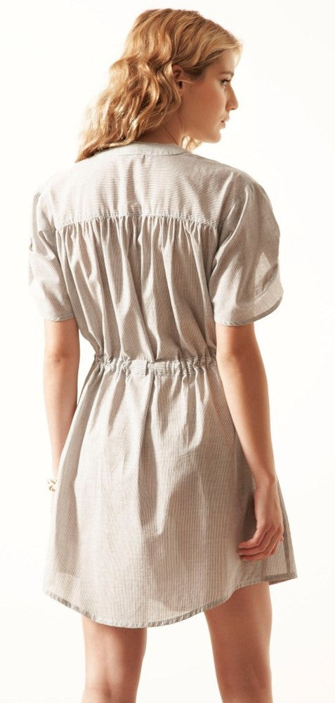 Versatile button-up shirt dress perfect for a walk in the park or a night on the town. The organic, loose-fitting shape is altered with a pull-in waist and gathered sleeve detail.
