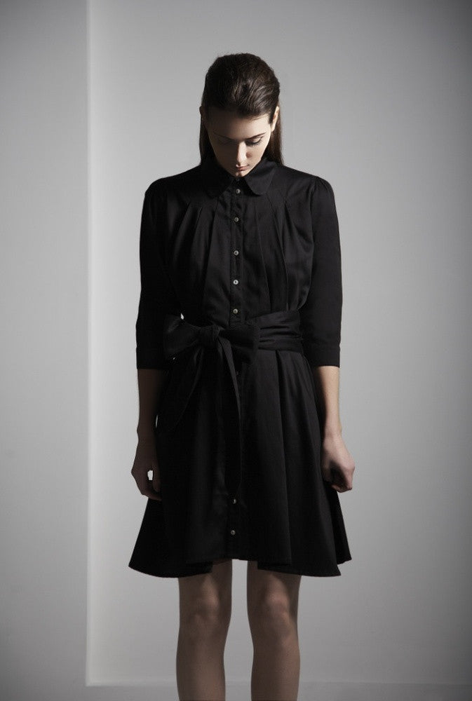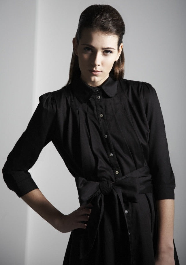 Our new re-worked essential shirt dress - pleats from the neck are fixed at the waist to create flattering fullness - pull in at the waist with the matching obi-style belt to create a modern silhouette.
