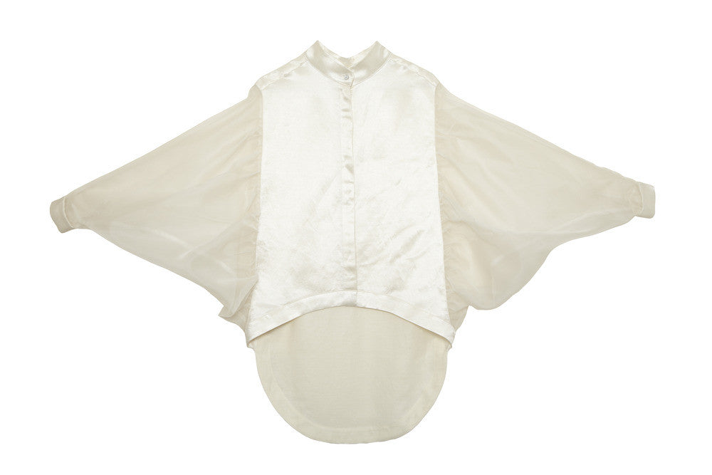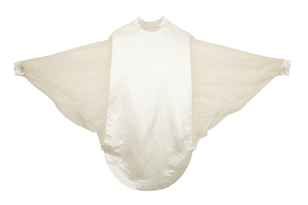A vintage inspired dramatic blouse with hemp silk panels front and back and sheer sleeves.