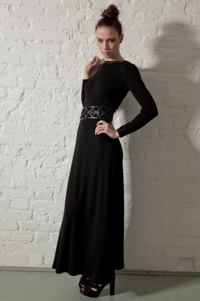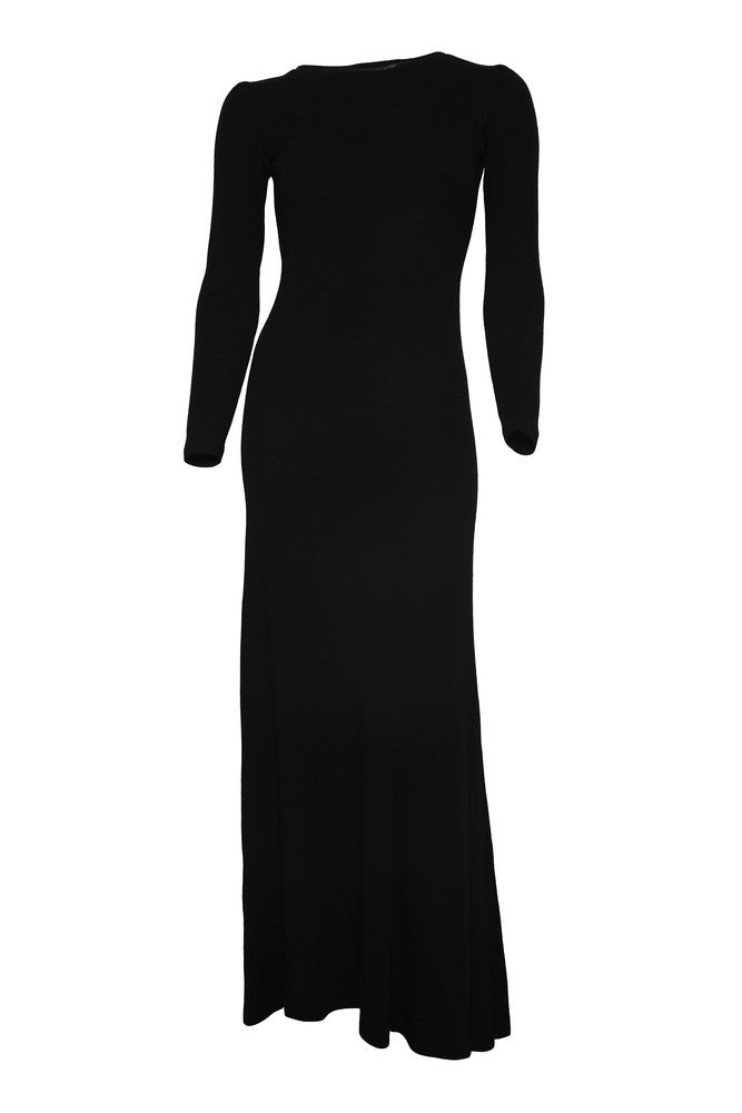 A vampy silhouette in soft merino wool jersey with elegant satin detail at the neckline.