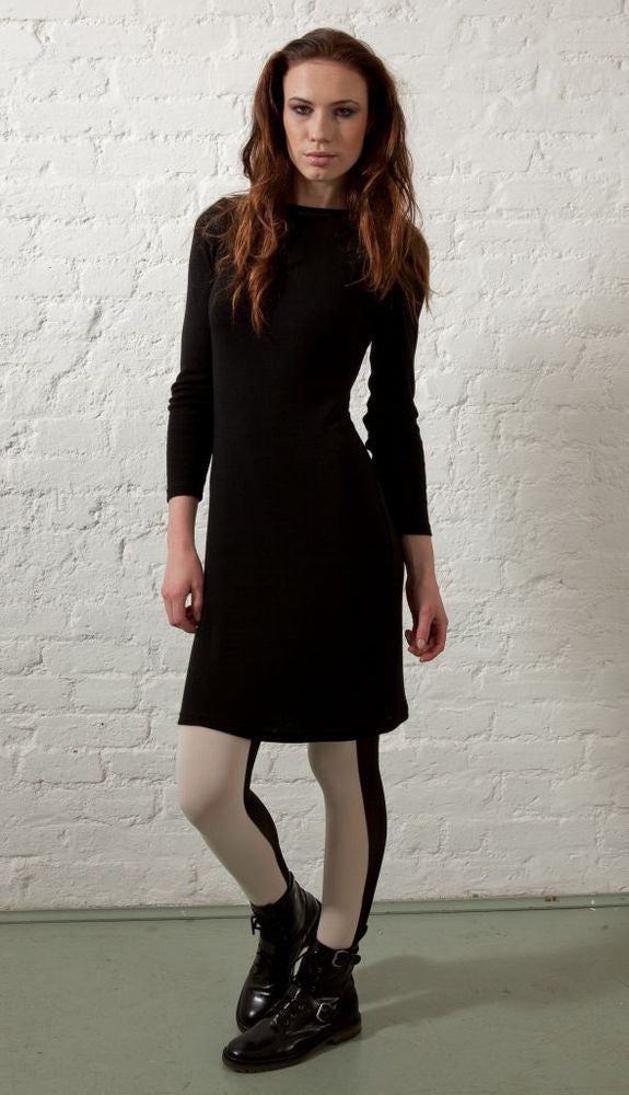 This deceptively simple, figure-skimming jersey dress is given a decorative touch with satin detail at the neckline.