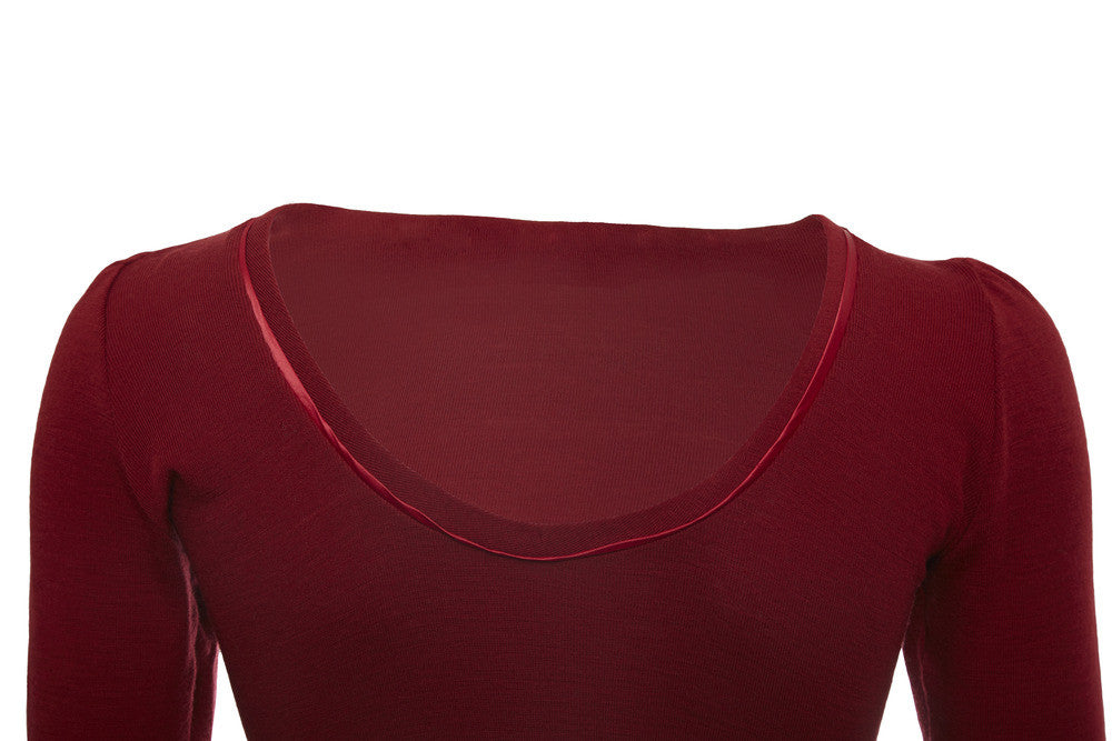 This deceptively simple, figure-skimming jersey dress is given a decorative touch with satin detail at the neckline.