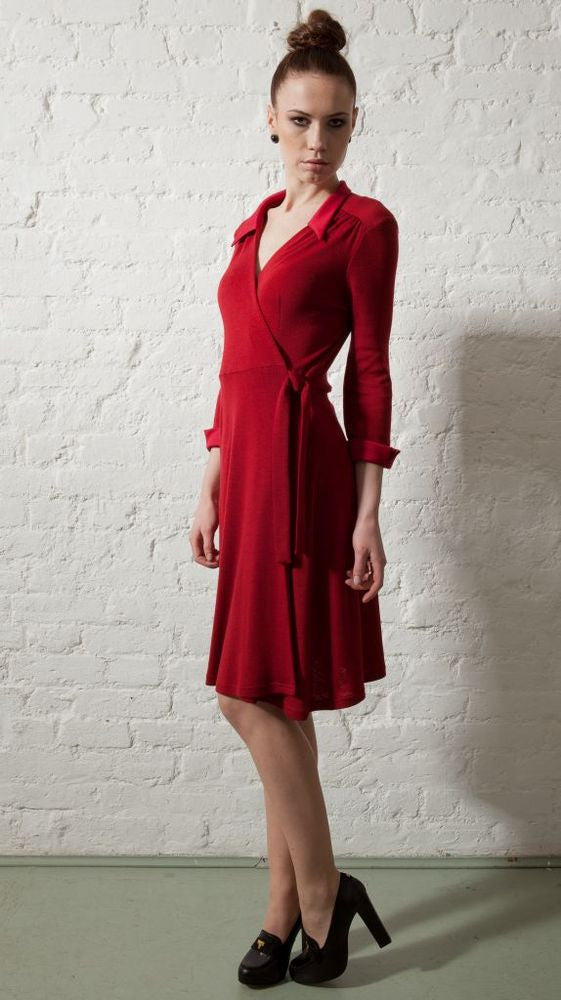 The Iconic wrap dress reimagined by Outsider so it is equally suitable for day or evening. The ultimate throw-on-and-go piece its effortless and flattering to every figure. Ties at the waist so it adjusts to fit your individual curves. The A-line skirt gives a lovely swish as you walk. Made from 100% Merino wool jersey, finished luxuriously with a contrast silk crepe de chine collar and cuffs. Also available in black. Was 175 - now 140!