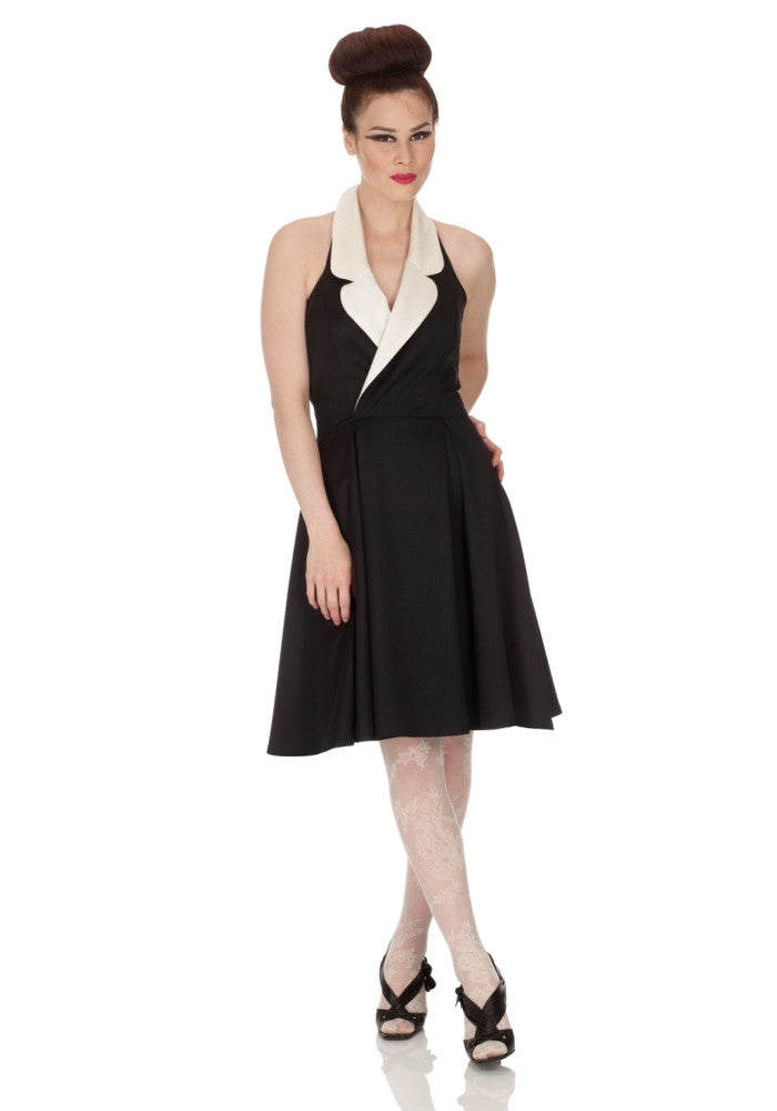 An effortlessly elegant evening dress. Halter neck style which buttons at the back neck. Made from 100% Organic Wool Suiting with the Ivory collar made from Hemp/Silk Satin. Fully lined, fastens with a concealed zip at the left side seam. Vintage inspired silhouette nips you in at the waist, the skirt is lovely and full so perfect for a twirl around the dance floor. Delicate Dry Clean only. Was 160 - now 130!